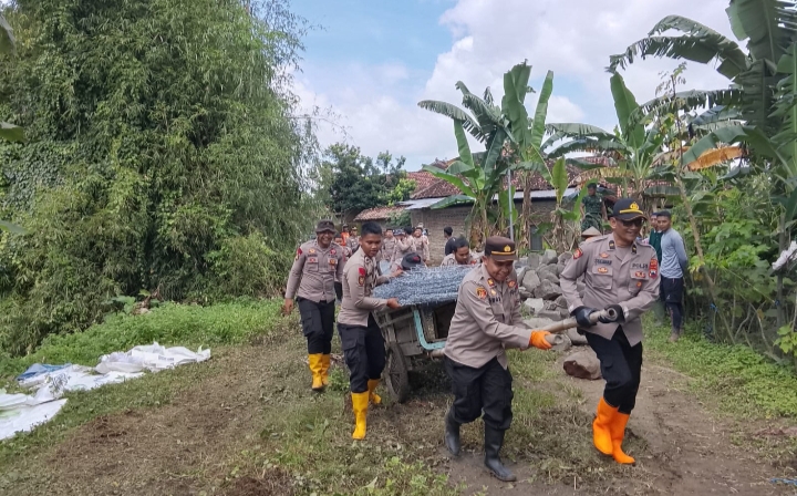Polres Klaten Bersama Instansi Terkait Gotong Royong Perbaiki Dua Tanggul Jebol Di Cawas