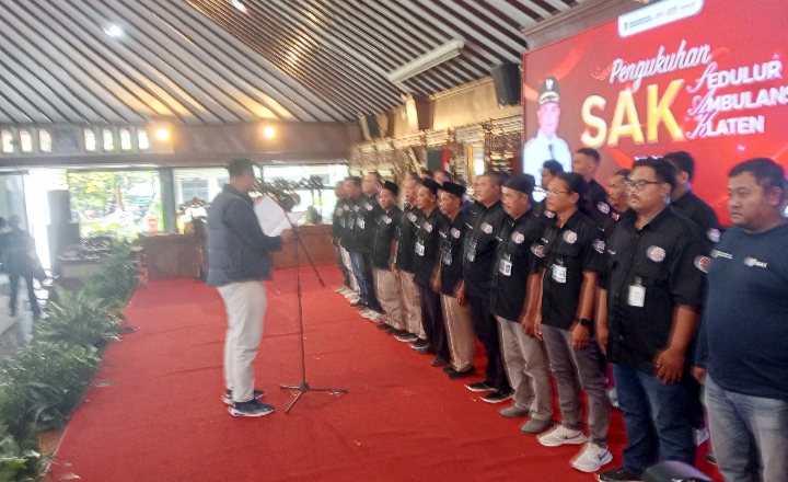Rolasan.id Klaten. ~ Bupati Klaten, Hamenang Wajar Ismoyo pada hari Ahad (19/4/2026) mengukuhkan Sedulur Ambulans Klaten (SAK) di Pendopo Pemkab Klaten. Pengukuran ini bertujuan memperkuat sinergi dan koordinasi relawan ambulans, memperkuat pelayanan darurat serta meningkatkan pelayanan sosial bagi masyarakat.